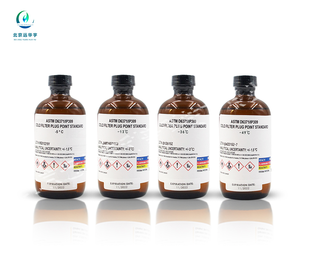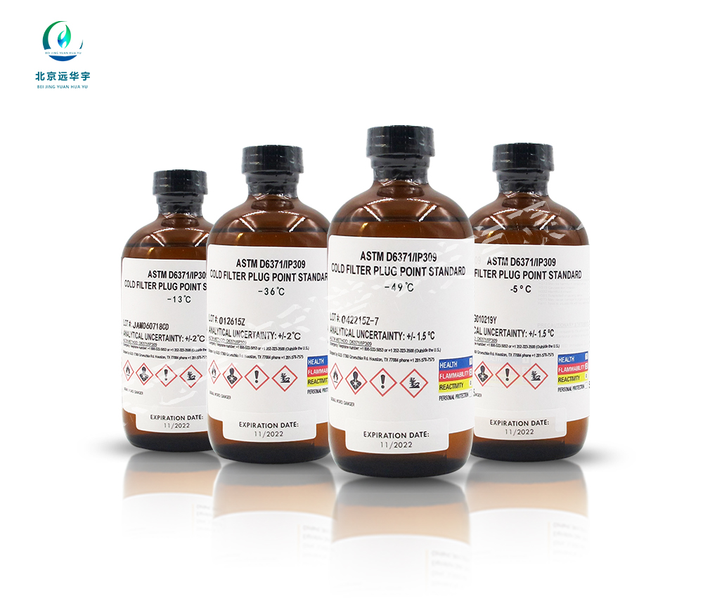 一、产品概述: 本标样测定结果,可用来评估燃料系统中燃料正常流动的最低温度。试样在规定条件下冷却,通过2kPa可控的真空装置,使试样经标准滤网过滤器吸入吸量管。试样每低于前次温度1℃,重复此步骤,直至试样中措状结晶析出量足够使流动停止或流速降低,记录试样充满吸量管的时间超过60s或不能完全返回到试杯时的温度作为试样的冷滤点。 冷滤点标椎物质COLD FIL TER PLUG POINT CFPP3:试样在规定条件下冷却,当试样不能流过过滤器或20mL试样流过过滤器的时间大于60s或试样不能完全流回试杯时的最高温度。 样品 标准号 数值/℃ 冷滤点标准物质 SH/T 0248 -49±2 二、使用方法:室温下(温度不低于5℃),将约50ml试样在干燥的滤纸上过滤。试验前,使试样达到30℃±5℃。 三、注意事项: 保质期:未开瓶保质期12个月 保存条件:-4℃-0℃避光保存 安全提示:对呼吸道/皮肤有刺激,远离火花、热源、明火,操作时采取防护措施,按国家标准处理废物。 Irritating to the airways/skin;Keep away from sparks,heat sources,flames;Take protective measures during operation;Disposal of waste accordingto national standards.