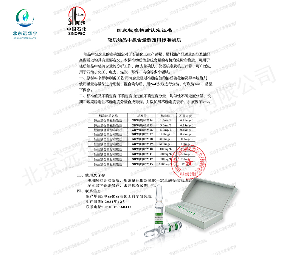 | 中文名称 | 石科院 轻油氯含量标准物质 轻油氯 |