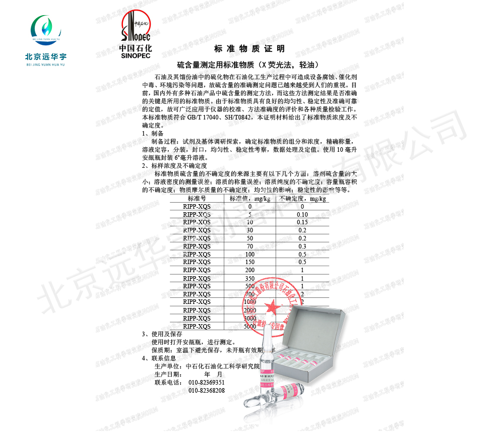 石油及其馏份油中的硫化物在石油化工生产过程中可造成设备腐蚀、催化剂中毒、环境污染等问题,故硫含量的准确测定问题已越来越受到人们的重视。目前,国内外有多种石油产品中硫含量的测定方法,而这些方法测定结果是否准确的关键是所用的标准物质。由于标准物质具有良好的均匀性、稳定性及准确可靠的定值,故可广泛应用于仪器的校准、方法准确度的评价和各种质量检验工作。本标准物质符合GB/T 17040、SH/T0842,本证明材料给出了标准物质浓度及不确定度。