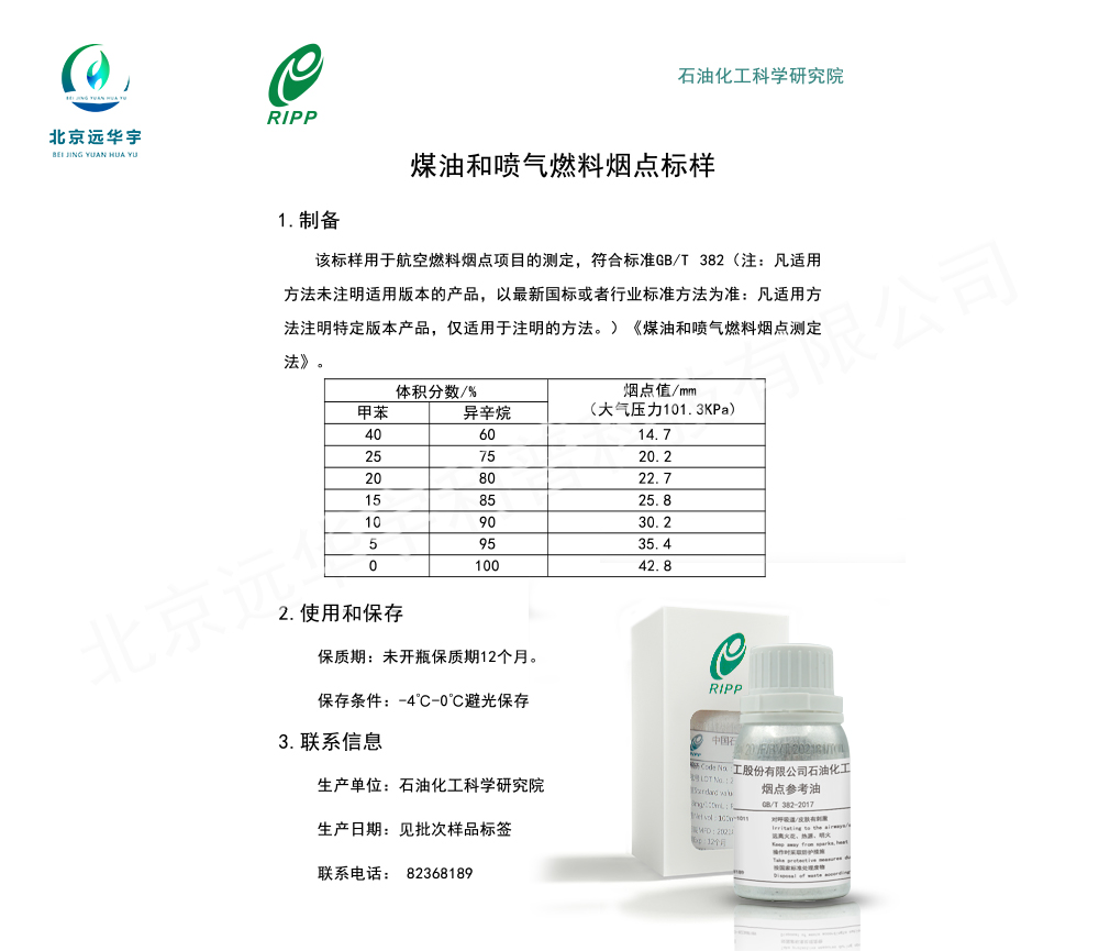 产品简介: 煤油和喷气燃料烟点测定:煤油和喷气 燃料在规定试验条件下燃烧时生成无烟火焰的最大高度。 制备:该标样适用于测定煤油和喷气燃料烟点项目测定,符合标准GB/T 382煤油和喷气燃料烟点测定法。