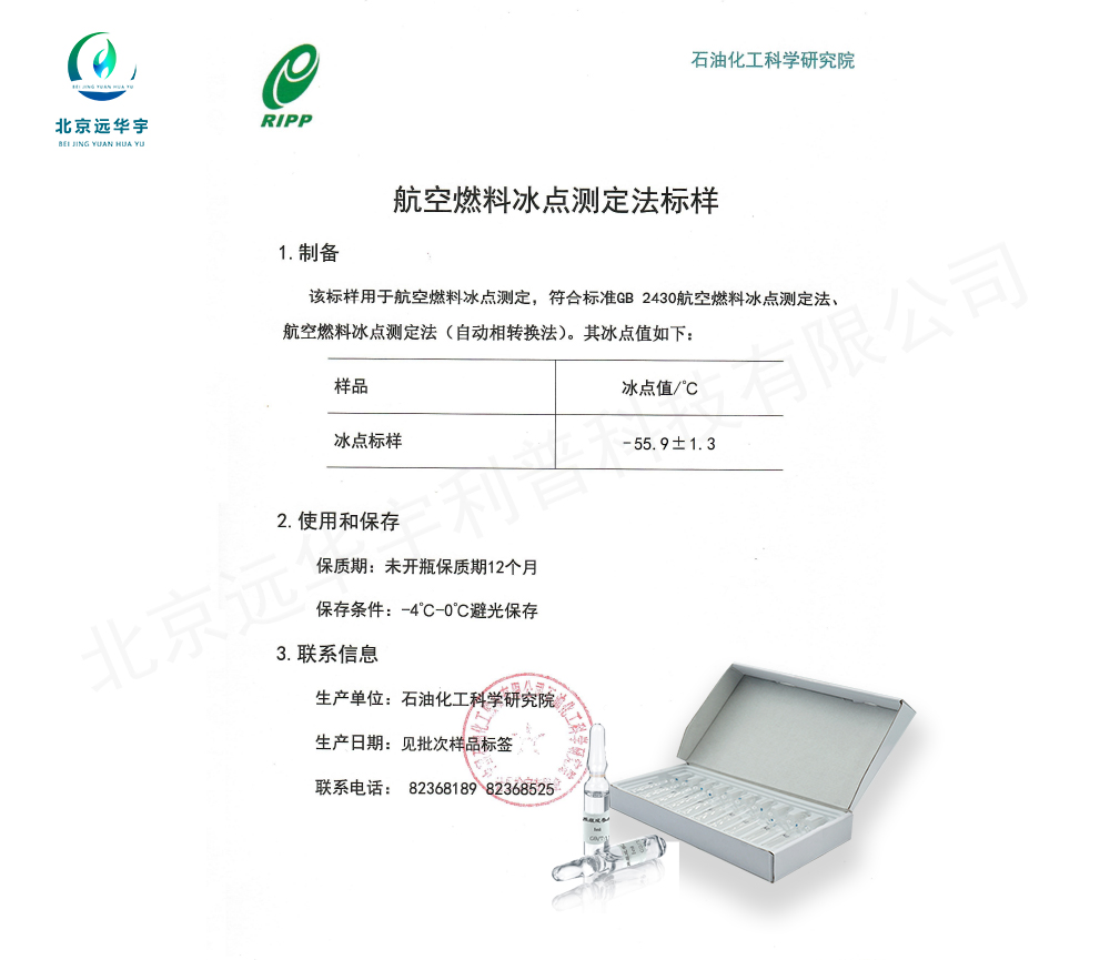 产品简介: 航空燃料冰点测定法标样:该标样用于航空燃料冰点测定,采用美国试验与材料协会标准ASTM D 5972《航空燃料冰点标准试验法(自动相转换法)》起草,符合标准SH/T 《航空燃料冰点标准试验法(自动相转换法)》。